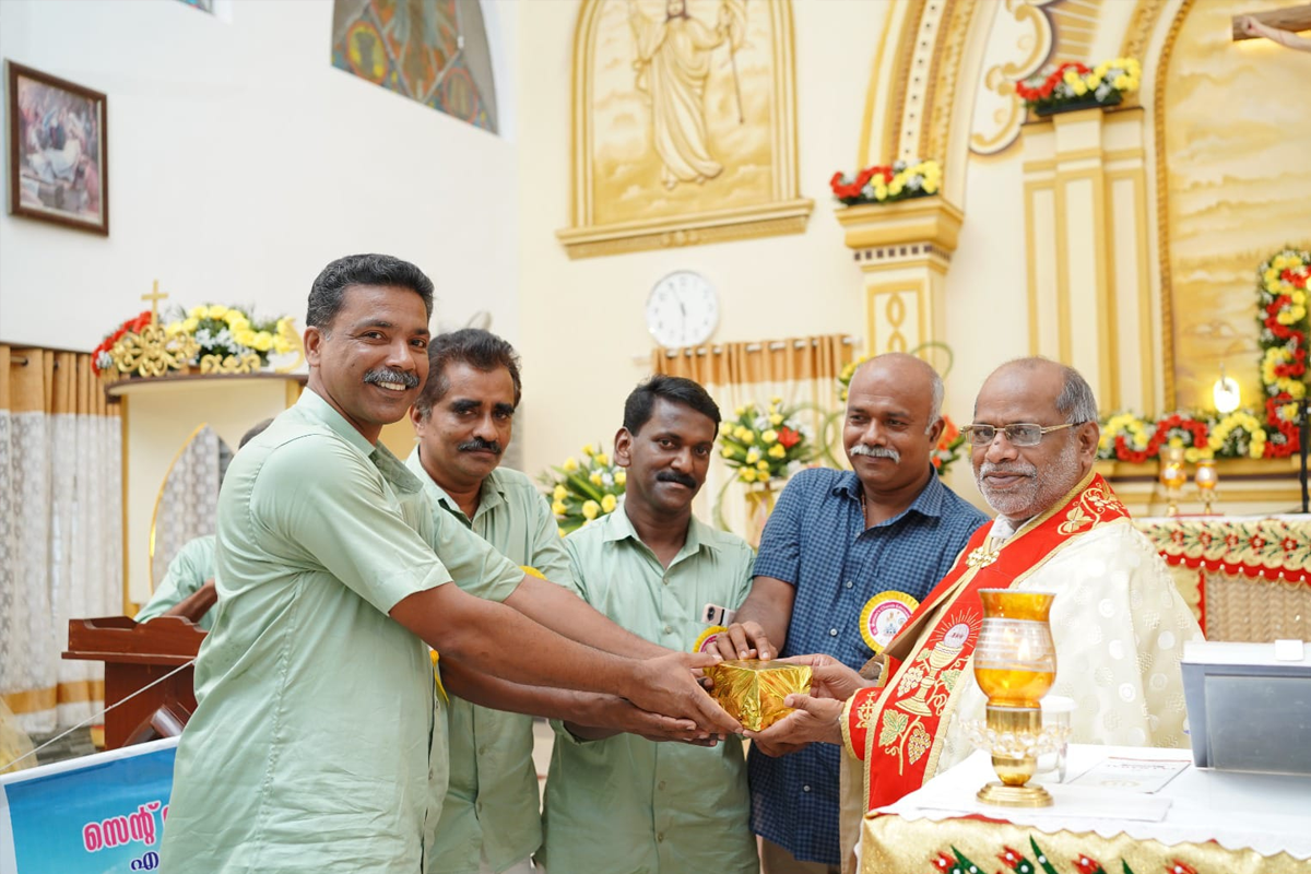 Reverend Sebastian Irimbachan offered the first Holy Communion in this shed on April 29, 1973. When this shed called St. George Prayer Center was destroyed by the wind, later we offered the Holy Mass at the house of Sree Cheripadath Appachan in Ponpara . In the early part of 1973, some of the settlers approached Sree Kapungal Sai Thalavi Haji, a prominent citizen of Edathanattukara, and he donated 10 cents of land in Ponpara for the construction of a church.